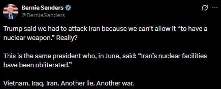 Он провёл исторические параллели: Вьетнамская война началась с подстроенного инцидента в Тонкинском заливе, Ирак — с фальшивых пробирок в ООН. Результат? Миллионы смертей и триллионы долларов, осевшие в карманах военных корпораций. Сандерс требует от коллег по Конгрессу срочно проголосовать за резолюцию, чтобы ограничить президентские полномочия в вопросах войны.