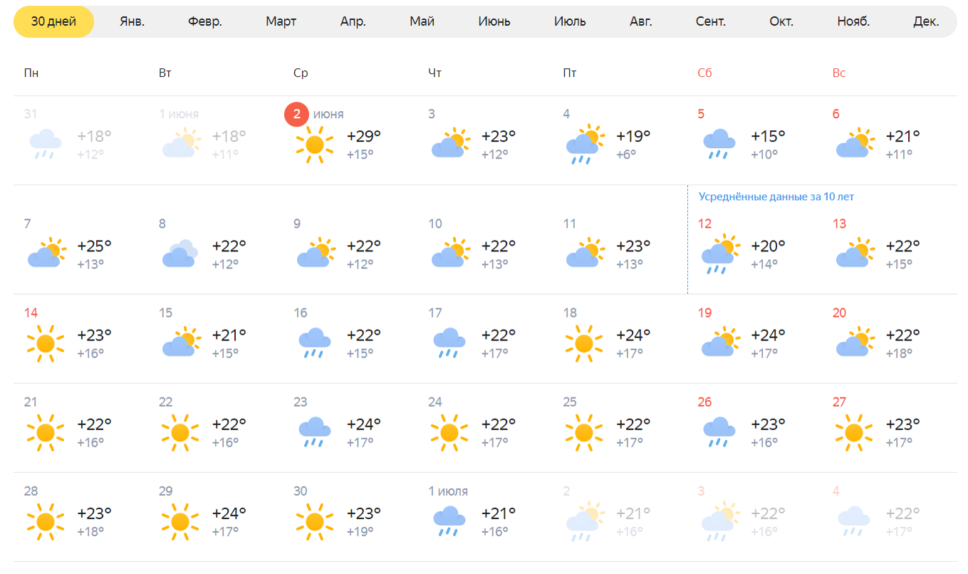 Сервис «Яндекс.Погода» сообщает, что из ближайших 30 дней прогнозируется 10 ясных, с переменной облачностью – 12, а с длительными осадками – 8. В первой половине июня температура будет колебаться от +6 до +29 градусов, а во второй +15 до +24.
