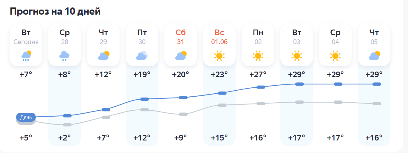 Зато начнётся календарное лето действительно по-летнему. "Яндекс. Погода" обещает 1 июня +23 градуса, 2 числа + 27, а с 3 по 5 июня сразу +29 градусов.