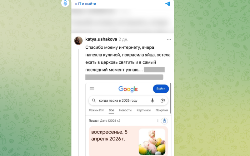 Как оказалось, при активном VPN браузер подставлял региональные настройки зарубежных стран, и в выдаче по запросу "Пасха 2026" отображалась дата католической Пасхи — 5 апреля, а не православной, выпадающей на 12 апреля. Многие пользователи ориентировались именно на эту информацию, заранее пекли куличи, красили яйца и начали праздничные приготовления, а потом столкнулись с неожиданной для себя информацией.