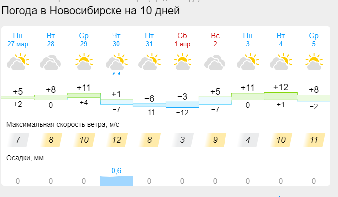 Сервис "Яндекс. Погода" прогнозирует максимум -9...-10 градусов мороза 30 и 31 марта, а днём в последние дни марта температура в городе, по прогнозам синоптиков, до -3...-5 градусов. А 1 апреля ожидается всего -1 градус ниже 0. В воскресенье, 2 апреля, в Новосибирске снова воздух прогреется до +4...+5 градусов.
