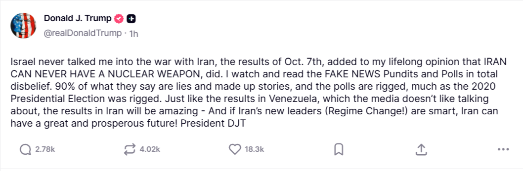 По словам американского лидера, слухи о том, что Израиль подталкивал его к этому решению, не соответствуют действительности. Он подчеркнул, что Тель-Авив никогда не просил Вашингтон воевать с Тегераном. Трамп написал: