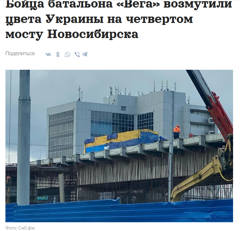 Военнослужащий элитного батальона "Вега", находящийся в отпуске, выразил недовольство по поводу цветового оформления защитных материалов, используемых при строительстве четвёртого моста через реку Обь в Новосибирске. На предоставленной фотографии видно, что укрывной материал выполнен в сине-желтых тонах, напоминающих флаг Украины.