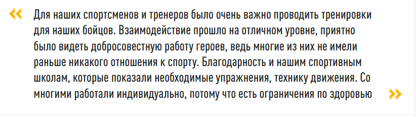 В рамках первого модуля проекта для участников спецоперации провели цикл зарядок с олимпийскими чемпионами и другим известными спортсменами. Зарядки, в частности, вели Ирина Минх, Виктор Маркин, Евгений Подгорный, Михаил Алоян. Освоить правильную технику плавания участникам проекта помогли мастера спорта России Сергей Герасимов и Евгений Болтовский.