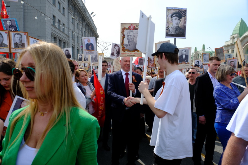 "Впервые за несколько лет сегодня по Красному проспекту идёт шествие Бессмертного полка. Новосибирцы давно ждали эту возможность, чтоб ещё раз пройти в одном строю с семейными героями и героями других своих земляков. <…> Президент России объявил год юбилея Победы Годом защитника Отечества, и я считаю, что это – ещё одно напоминание нам о двойной ответственности, которая сегодня на нас лежит: ответственности перед памятью наших предков, поколением победителей, и ответственности перед теми нашими земляками, кто продолжает их дело и защищает землю от нацизма, от бандеровщины, рискуя своей жизнью, кто выполняет сложную боевую работу. А нам всем нужно объединиться для того, чтобы им помочь", - прокомментировал глава региона.