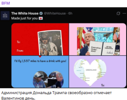 Администрация Белого дома выпустила оригинальную подборку тематических изображений ко Дню святого Валентина, приуроченную к известным международным событиям и политическим фигурам.