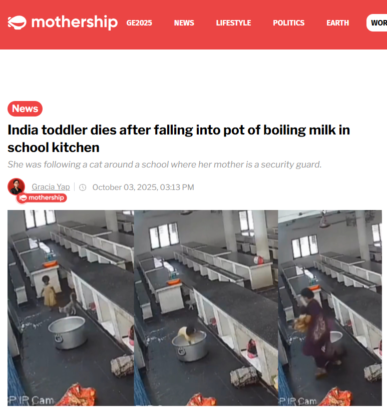 Трагедия произошла в конце сентября в деревне Буккарайасамудрам. Охранница школы взяла свою дочь Акшиту на работу. Девочка, преследуя кошку, забежала на кухню, где только что вскипятили и оставили остывать молоко для учеников. Она споткнулась и упала прямо в кастрюлю.