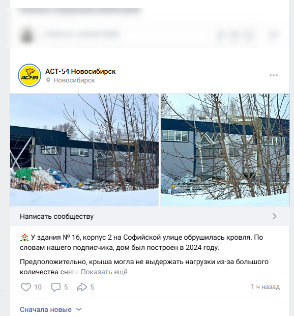 В новосибирском микрорайоне ОбьГЭС рухнула крыша производственно-хозяйственного корпуса строительной компании на улице Софийской, 16к2, построенного в 2024 году. Предварительной причиной называют скопление снега.