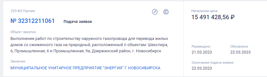 В документации сказано, что речь идёт о домах на ул. Шекспира, 6, ул. Промышленной, 6 и ул. Промышленной, 9а. По условиям контракта подрядчик обязуется протянуть 1189 метров наружного газопровода в 150-дневный срок. За работу власти готовы заплатить почти 15,5 млн рублей.