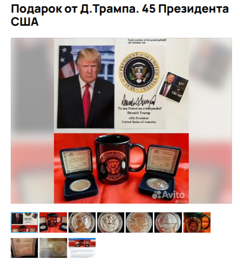 Более того, продавец утверждает, что эти предметы переданы в Россию дипломатической почтой в 2017 году и представляют собой "подарок от 45-го президента США".