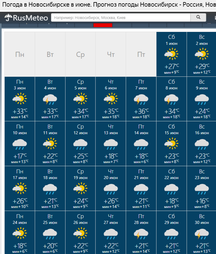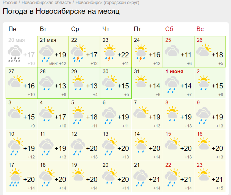 Погодный сервис "Гисметео" даёт менее оптимистичный прогноз. В первую и вторую декады месяца в Новосибирске ожидается максимум +20 градусов тепла. Погода будет преимущественно пасмурной и дождливой.