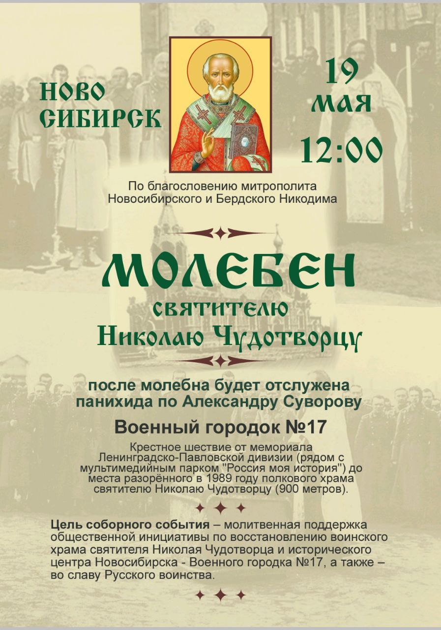 По благословению правящего архиерея митрополита Новосибирского и Бердского Никодима во вторую седмицу после Пасхи в Новосибирске совершат молебен покровителю Ново-Николаевска.