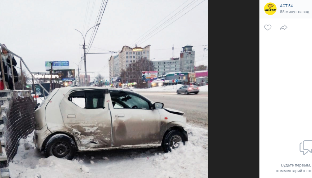 В Новосибирске автомобиль Nissan попал в ДТП на перекрёстке улиц Кирова и Добролюбова. В результате аварии иномарку выбросило на тротуар, она врезалась в крыльцо расположенного у дороги магазина.