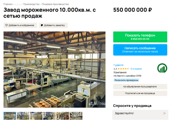На популярном сайте объявлений появилось предложение о продаже завода по производству мороженого. Выручка предприятия, по словам продавцов, составляет более 1 миллиарда рублей в год.