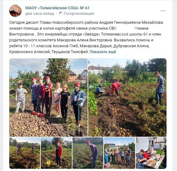 Жена военнослужащего обратилась за помощью в местную школу. На просьбу откликнулись юнармейцы отряда "Звезда" и член родительского комитета Алёна Макарова – всего восемь человек. К школьному десанту присоединились соседи. Все вместе дружно убрали урожай, после чего пообедали во дворе дома.