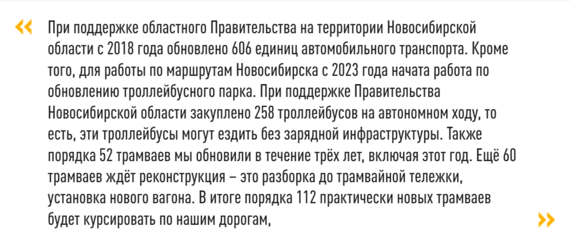 Для обновления транспорта в Новосибирской области используются возможности нескольким программ. Например, нацпроекта «Безопасные качественные дороги», в рамках которого для Новосибирска в течение нескольких лет было закуплено 58 троллейбусов с автономным ходом марки «Горожанин». Ещё две сотни такого же типа транспортных средств поставляется по договору лизинга. Эти троллейбусы обладают возможностью проехать до 20 км без подключения к контактной сети, к тому же они значительно более комфортные для самих пассажиров.