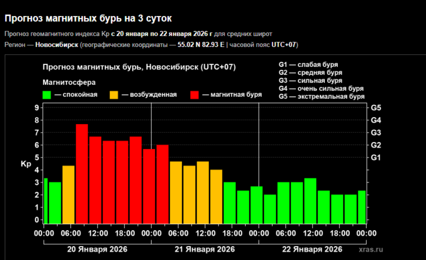 Геомагнитная обстановка начнёт стабилизироваться  21 января, но полностью всё придёт в норму не ранее, чем через 2-3 суток.