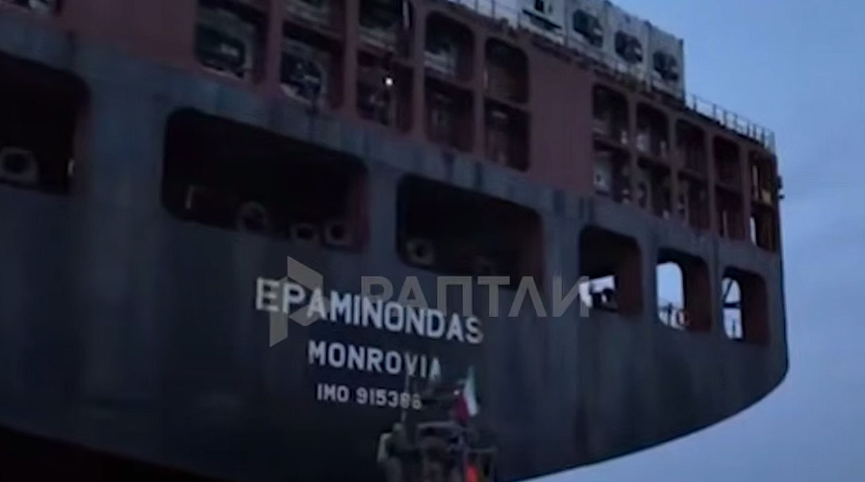 На видео запечатлен подход одного катера под иранским флагом к судну MSC Francesca: военнослужащие КСИР с автоматами поднимаются на борт. Затем второй катер приближается к Epaminondas.