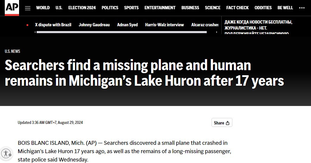 Год назад в США были возобновлены поиски самолёта, который разбился на озере Гурон 17 лет назад. Родственники Брука Стауффера-младшего, находившегося тогда в самолёте, обратились в частную компанию в 2023 году, так как не теряли надежды найти его останки.