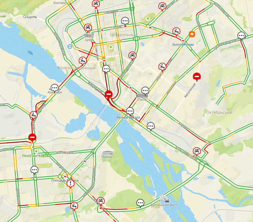 На карте также отмечены многочисленные аварии и места работ, из-за которых приходится перекрывать проезд.