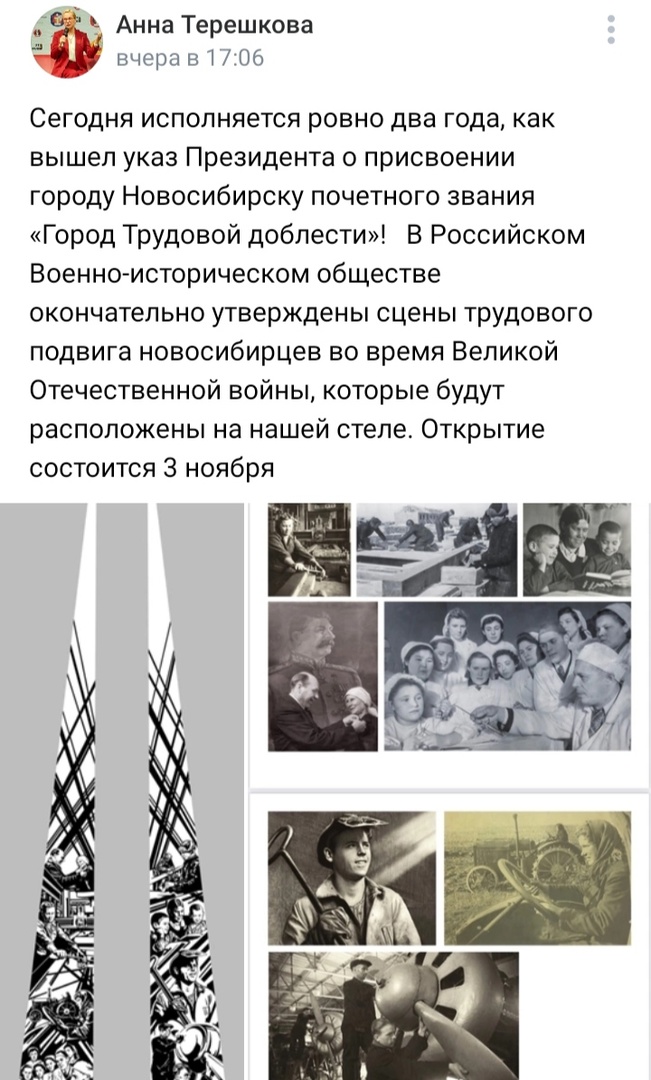 "В военно-историческом обществе окончательно утверждены сцены трудового подвига, которые будут расположены на нашей стеле", – пишет Терешкова.