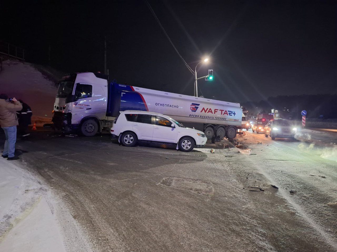 По предварительной информации, женщина не справилась с управлением. На "встречке" она столкнулась с полуприцепом-цистерной Volvo. Судя по фотографиям с места ДТП и словам подписчиков "АСТ-54", это был бензовоз.