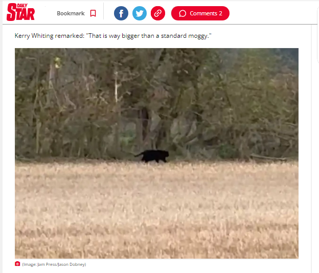 Британец рассказ СМИ, что существо охотилось в соседнем поле на кролика. По словам 44-летнего Джейсона Добни, на домашнюю крупную кошку оно не похоже. Он видел больших кошек, но этот зверь был крупнее ротвейлера.