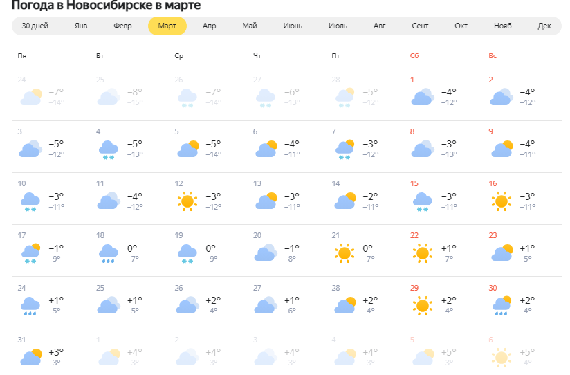 Отметим, что в предварительном прогнозе "Яндекс Погода" на март в Новосибирске, основанном на многолетних наблюдениях, нет указаний на сильные морозы.
