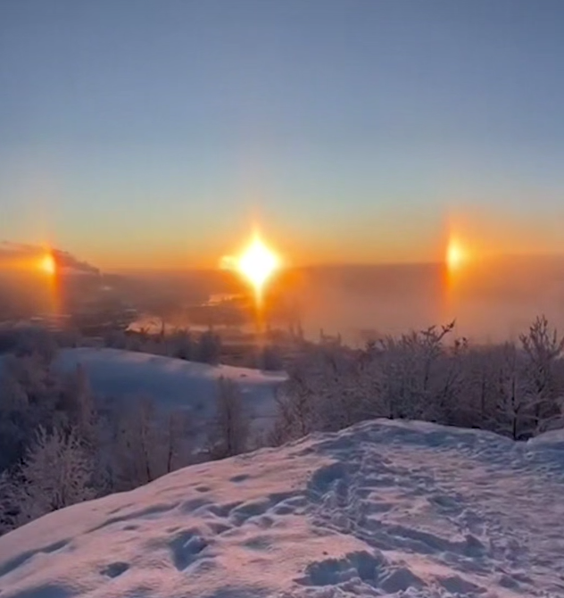 В Заполярье зафиксировали уникальное природное явление – жители Мурманска и области несколько дней подряд могли наблюдать в небе солнечное и лунное гало, световые столбы и эффект "трёх солнц". Явления были вызваны сочетанием сильных морозов и высокой влажности воздуха.